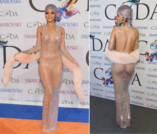 Está certo que Rihanna não se preocupa muito em mostrar mais do que deve e já apareceu diversas vezes com looks reveladores ao extremo. Mas ela conseguiu reinventar sua ousadia ao surgir no CFDA Awards, em junho, com um vestido transparente todo coberto por cristais Swarovski assinado por Adam Selman. Para cobrir os seios eventualmente (muito eventualmente), ela lançou mão de uma estola.